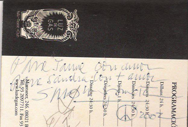 La sensación que tuve ese día que lo vi por primera vez fue deslumbrante, el repertorio, sus músicos, la forma de cantar, las palabras que decía y su comportamiento ejemplar. Esa fue también mi primera visita a ese maravilloso Luz de Gas el nombre de la sala parecía como si estuviera en alguna de sus letras. Una vez terminado el concierto lo espere en la puerta , después de hablar un poco con el bajista Javier Malosetti, lo vi salir y pude sacar alguna tímida palabra de mis cuerdas vocales para saludarlo, le pedí una firma y en medio de su timidez me dijo que estaba contracturado en la mano, claro después de los solos que había tocado durante 3 horas era medianamente lógico, igualmente agarre una piedra de Jade que tenia colgada en mi cuello desde 1997 se la puse en la mano, le di la mano, me abrazo, me dio dos besos y se subió al auto. En ese momento aprecio mi hermana quien no había visto el show y había venido a buscarme, al ver que no me había firmado se acerco y le toco la ventanilla, el amablemente la atendió y le dijo que no podía firmarle nada por que un chico le había pedido antes un autógrafo y que no podía hacer excepciones, cuando ella le dijo que era mi hermana, Luis agarro el Flyer de Luz de Gas y escribió: “Para Jaime con Amor y para Sandra con + amor”.